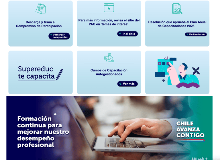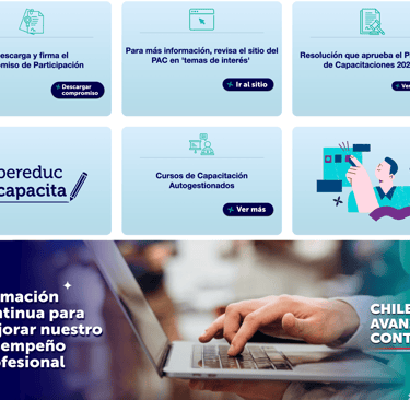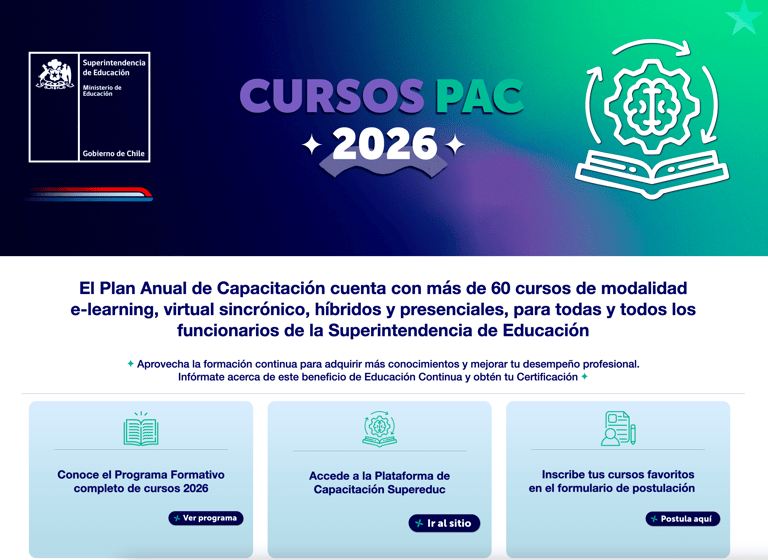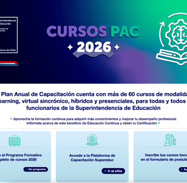 A continuación, se presenta un segundo diseño de landing page para público interno, con el motivo de realizar una campaña de difusión para la inscripción de cursos del Plan Anual de Capacitación de la Supereduc. Este sitio, logra llegar a todos los archivos y documentos relacionados para la inscripción de los cursos ofrecidos. 2026.